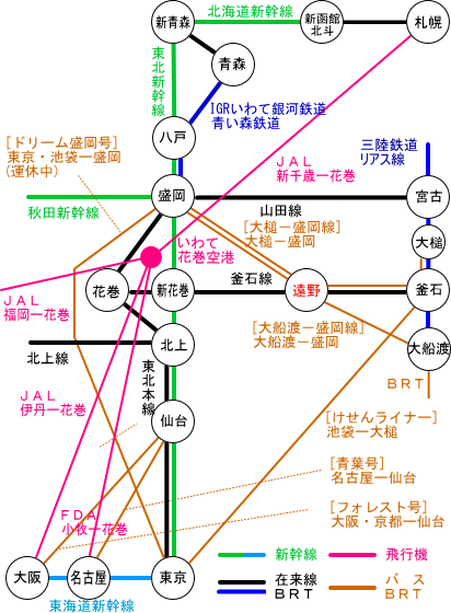 | 札幌(新千歳)ー花巻 ・約1時間 名古屋(小牧)ー花巻 ・約1時間10分 大阪(伊丹)ー花巻 ・約1時間20分 福岡ー花巻 ・約2時間 |